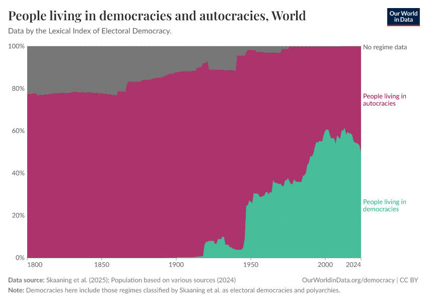 In the second half of the 20th century, the world changed significantly: Colonial empires ended, and more countries turned democratic. The share of the world population living in democracies increased from 25% in 1950 to 35% in 1980. Particularly important was the breakdown of the Soviet Union, which allowed more countries to democratize. It is worrying, however, that the share of people living in democracies has not increased in recent years.