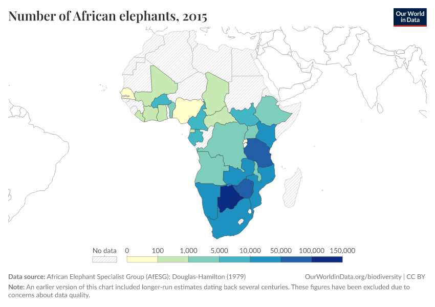 In a previous version of this chart, I showed a time-series of elephant populations dating back to 1500. This estimated that centuries ago, there were 26 million elephants on the continent. Since then, there has been debate around the quality and credibility of these figures. While in the original chart we made clear that long-run estimates — especially those for from 1900 or earlier — are very crude and come with large uncertainty, the quality of these estimates may be too low to include in our longer time-series.