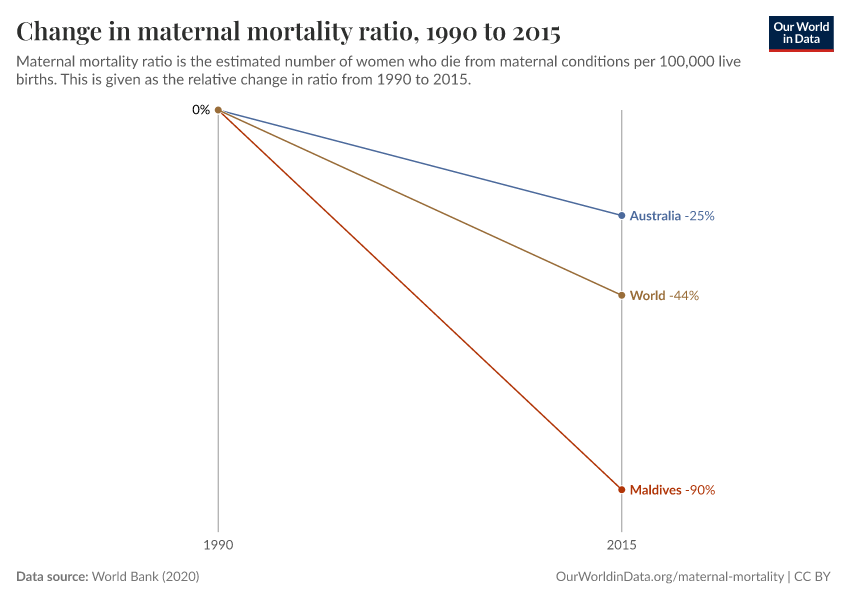 For example, Australia has a value of -25% because its maternal mortality rate fell by 25% — from 8 to 6 deaths per 100,000 — from 1990 to 2015. The Philippines also achieved a reduction of 25%, starting from 150, meaning a reduction of around 35 deaths per 100,000. Countries with a positive value saw a rise in mortality over this period.