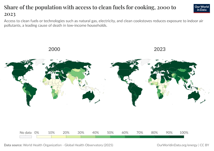 World Health Organization - Global Health Observatory (2025) – processed by Our World in Data. “Share of the population with access to clean fuels for cooking” [dataset]. World Health Organization, “Global Health Observatory” [original data]. Retrieved March 17, 2026 from https://admin-refresh-dis.owid.pages.dev/grapher/access-to-clean-fuels-and-technologies-for-cooking