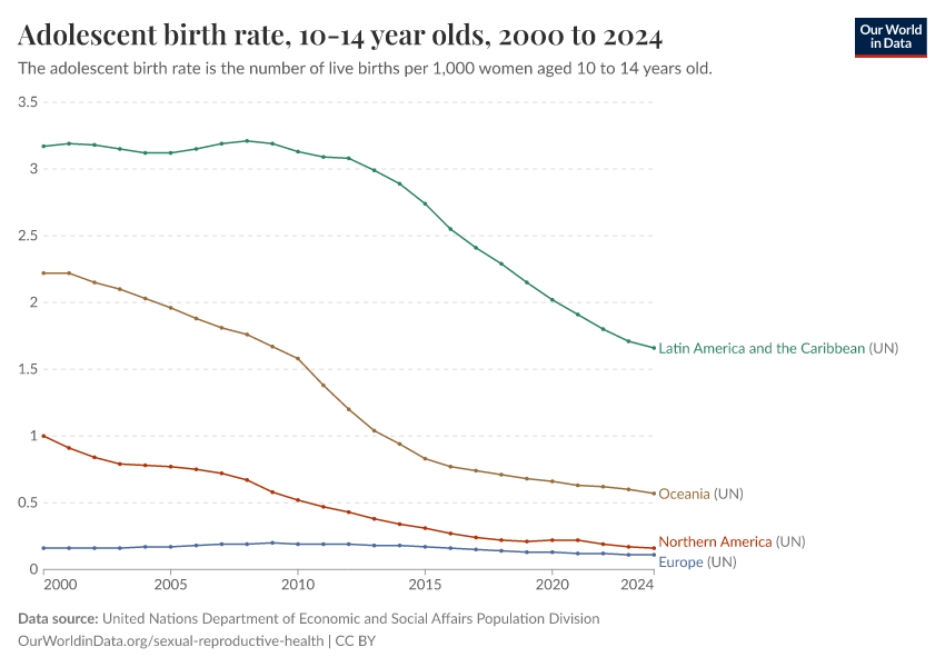 United Nations Department of Economic and Social Affairs Population Division – processed by Our World in Data. “Adolescent birth rate, 10-14 year olds” [dataset]. United Nations Department of Economic and Social Affairs Population Division, “Data from multiple sources” [original data]. Retrieved March 13, 2026 from https://admin-refresh-dis.owid.pages.dev/grapher/adolescent-fertility