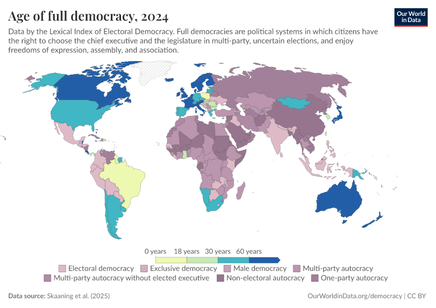 Skaaning et al. (2025) – processed by Our World in Data. “Age of full democracy” [dataset]. Skaaning et al., “Lexical Index of Electoral Democracy (LIED) v6.8” [original data]. Retrieved March 13, 2026 from https://admin-refresh-dis.owid.pages.dev/grapher/age-of-full-democracy