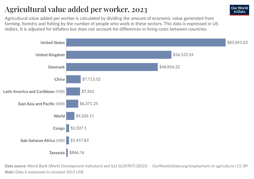 World Bank (World Development Indicators) and ILO (ILOSTAT) (2025) – processed by Our World in Data. “Agricultural value added per worker” [dataset]. World Bank (World Development Indicators) and ILO (ILOSTAT), “World Development Indicators 122” [original data]. Retrieved March 13, 2026 from https://admin-refresh-dis.owid.pages.dev/grapher/agriculture-value-added-per-worker-wdi