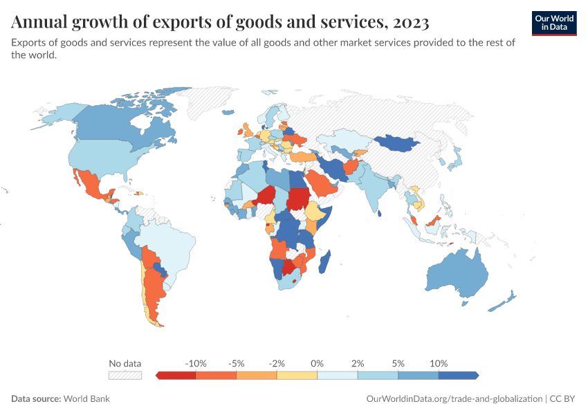 “Data Page: Annual growth of exports of goods and services”. Our World in Data (2026). Data adapted from World Bank. Retrieved from https://admin-refresh-dis.owid.pages.dev/grapher/annual-growth-of-exports-of-goods-and-services [online resource]How to cite this data