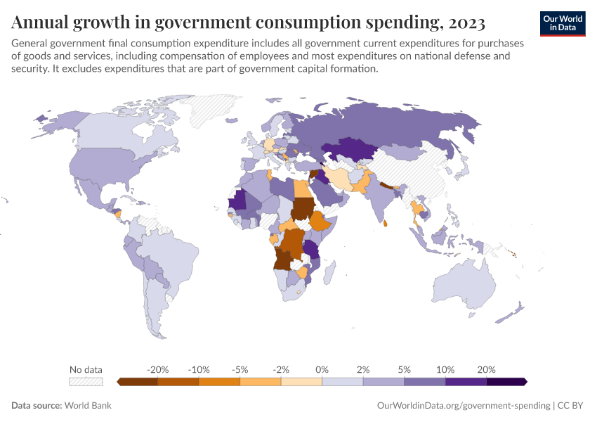“Data Page: Annual growth in government consumption spending”. Our World in Data (2026). Data adapted from World Bank. Retrieved from https://admin-refresh-dis.owid.pages.dev/grapher/annual-growth-of-general-government-final-consumption-expenditure [online resource]How to cite this data
