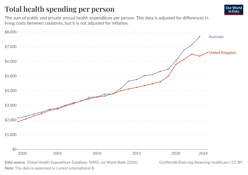 “Data Page: Total health spending per person”. Our World in Data (2026). Data adapted from Global Health Expenditure Database, WHO, via World Bank. Retrieved from https://admin-refresh-dis.owid.pages.dev/grapher/annual-healthcare-expenditure-per-capita [online resource]
