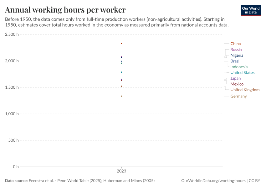 “Data Page: Annual working hours per worker”, part of the following publication: Charlie Giattino, Esteban Ortiz-Ospina, and Max Roser (2020) - “Working Hours”. Data adapted from Feenstra et al., Huberman and Minns. Retrieved from https://admin-refresh-dis.owid.pages.dev/grapher/annual-working-hours-per-worker [online resource]How to cite this data