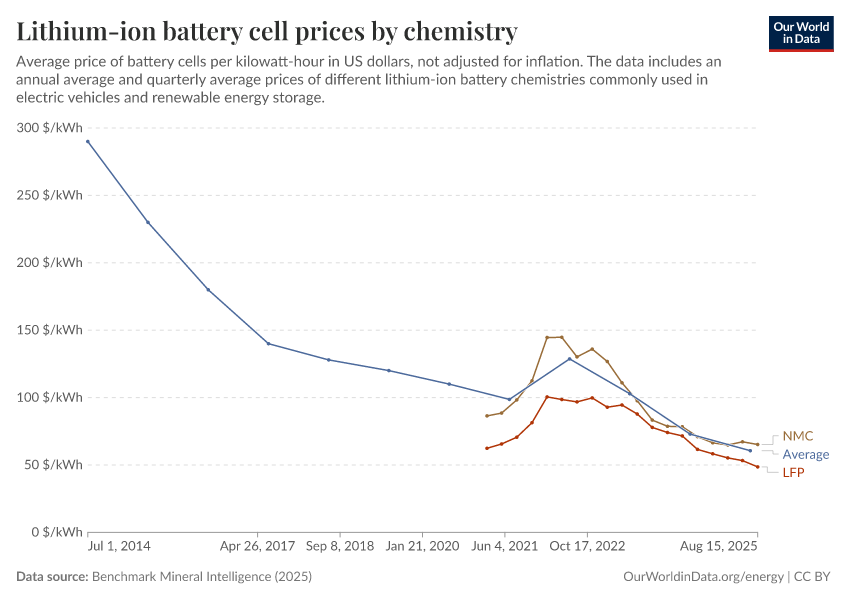 Benchmark Mineral Intelligence (2025) – with minor processing by Our World in Data. “Lithium-ion battery cell prices by chemistry” [dataset]. Benchmark Mineral Intelligence, “Lithium-ion battery prices”; Benchmark Mineral Intelligence, “Battery prices by chemistry” [original data]. Retrieved March 13, 2026 from https://admin-refresh-dis.owid.pages.dev/grapher/average-battery-cell-price