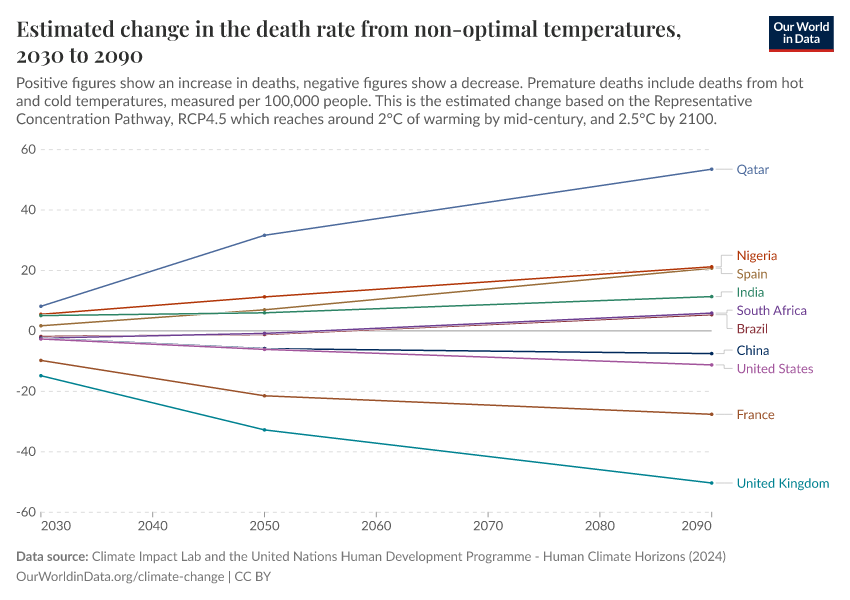 Climate Impact Lab and the United Nations Human Development Programme - Human Climate Horizons (2024) – processed by Our World in Data. “Estimated change in the death rate from non-optimal temperatures” [dataset]. Climate Impact Lab and the United Nations Human Development Programme, “heat_deaths_undp_climate_horizons” [original data]. Retrieved March 13, 2026 from https://admin-refresh-dis.owid.pages.dev/grapher/change-heat-death-rate