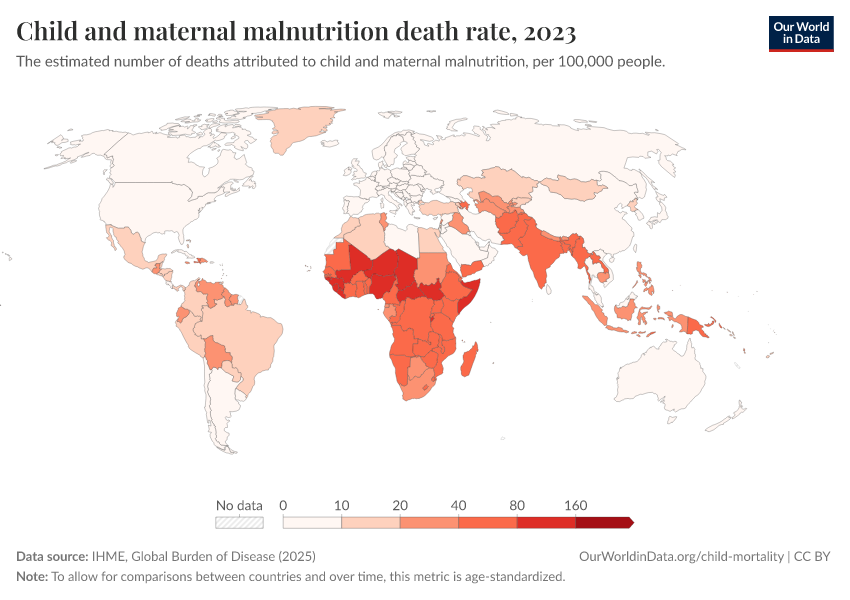 IHME, Global Burden of Disease (2025) – with major processing by Our World in Data. “Child and maternal malnutrition death rate” [dataset]. IHME, Global Burden of Disease, “Global Burden of Disease - Risk Factors - Deaths” [original data]. Retrieved March 13, 2026 from https://admin-refresh-dis.owid.pages.dev/grapher/child-and-maternal-malnutrition-death-rate