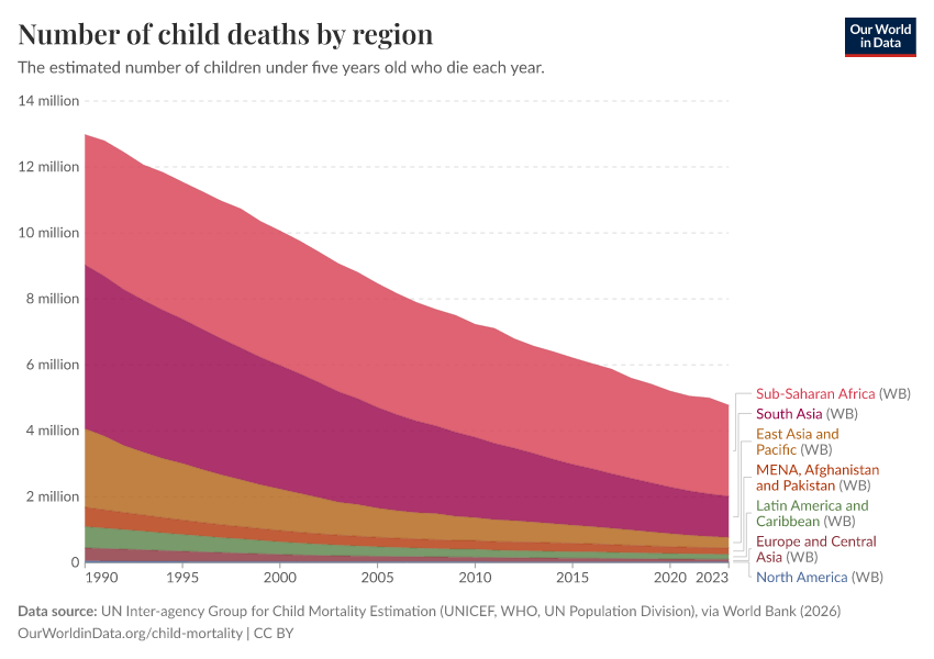 UN Inter-agency Group for Child Mortality Estimation (UNICEF, WHO, UN Population Division), via World Bank (2026) – processed by Our World in Data. “Number of child deaths by region” [dataset]. UN Inter-agency Group for Child Mortality Estimation (UNICEF, WHO, UN Population Division), via World Bank, “World Development Indicators 125” [original data]. Retrieved March 13, 2026 from https://admin-refresh-dis.owid.pages.dev/grapher/child-deaths-igme-data