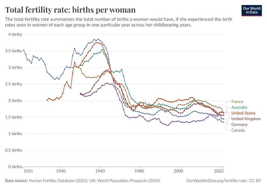 “Data Page: Fertility rate: births per woman”, part of the following publication: Saloni Dattani, Lucas Rodés-Guirao, and Max Roser (2025) - “Fertility Rate”. Data adapted from Human Fertility Database, United Nations. Retrieved from https://admin-refresh-dis.owid.pages.dev/grapher/children-born-per-woman [online resource]How to cite this data