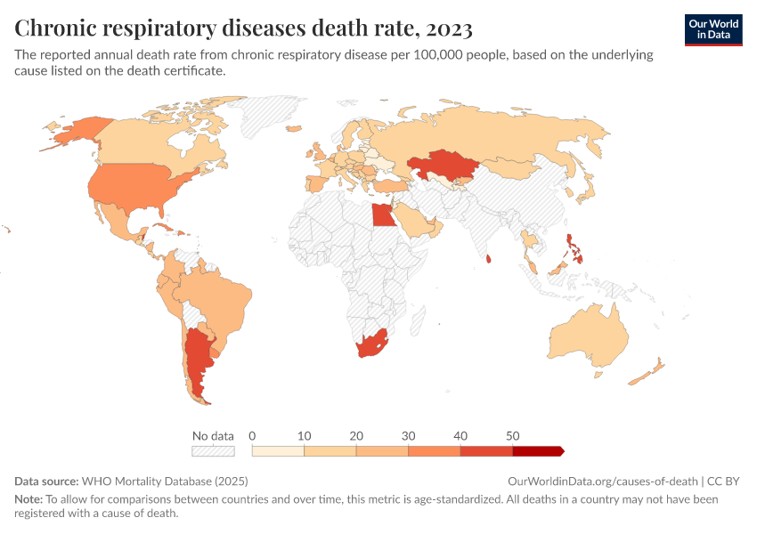 “Data Page: Chronic respiratory diseases death rate”, part of the following publication: Saloni Dattani, Fiona Spooner, Hannah Ritchie, and Max Roser (2023) - “Causes of Death”. Data adapted from WHO Mortality Database. Retrieved from https://admin-refresh-dis.owid.pages.dev/grapher/chronic-respiratory-diseases-death-rate-who-mdb [online resource]How to cite this data