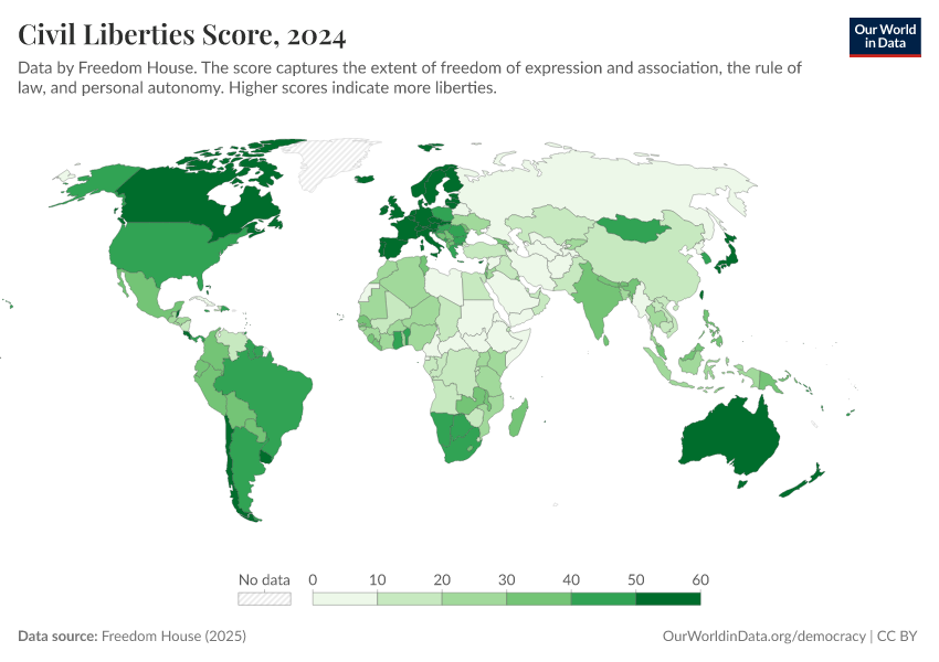 Freedom House (2025) – processed by Our World in Data. “Civil Liberties Score” [dataset]. Freedom House, “Freedom in the World” [original data]. Retrieved March 13, 2026 from https://admin-refresh-dis.owid.pages.dev/grapher/civil-liberties-score-fh