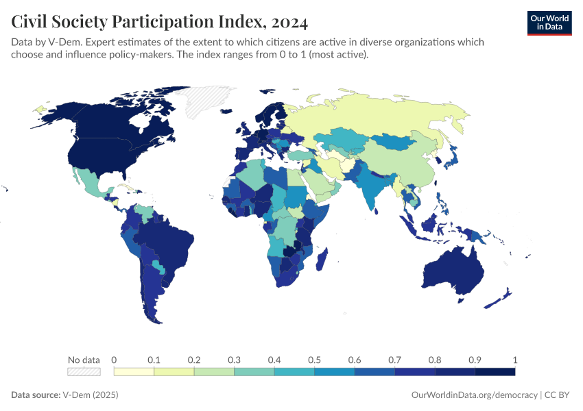 “Data Page: Civil society participation index”, part of the following publication: Bastian Herre, Lucas Rodés-Guirao, and Esteban Ortiz-Ospina (2013) - “Democracy”. Data adapted from V-Dem. Retrieved from https://admin-refresh-dis.owid.pages.dev/grapher/civil-society-participation-index [online resource]How to cite this data