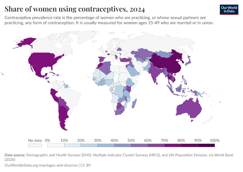 Demographic and Health Surveys (DHS), Multiple Indicator Cluster Surveys (MICS), and UN Population Division, via World Bank (2026) – processed by Our World in Data. “Share of women using contraceptives” [dataset]. Demographic and Health Surveys (DHS), Multiple Indicator Cluster Surveys (MICS), and UN Population Division, via World Bank, “World Development Indicators 125” [original data]. Retrieved March 13, 2026 from https://admin-refresh-dis.owid.pages.dev/grapher/contraceptive-prevalence-any-methods-of-women-ages-15-49