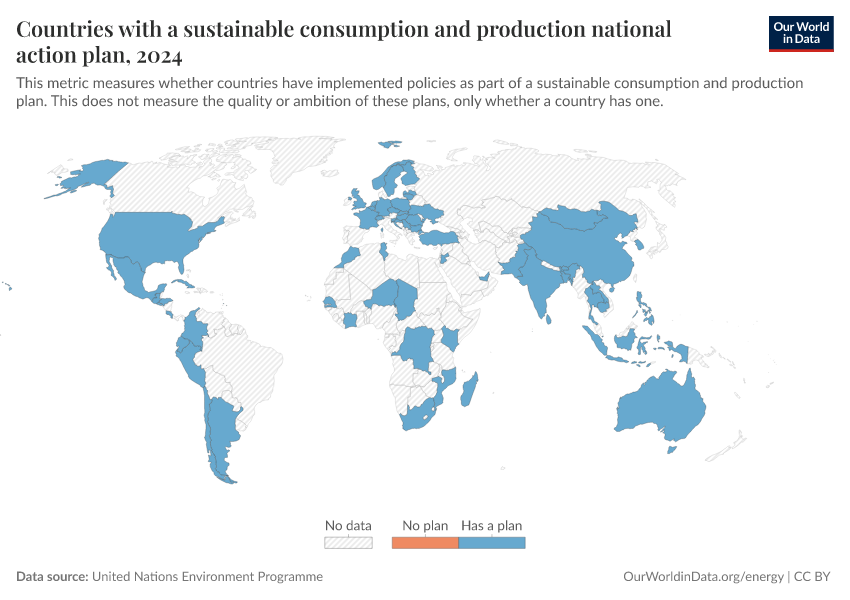 “Data Page: Countries with a sustainable consumption and production national action plan”. Our World in Data (2026). Data adapted from United Nations Environment Programme. Retrieved from https://admin-refresh-dis.owid.pages.dev/grapher/country-scp-plan [online resource]How to cite this data