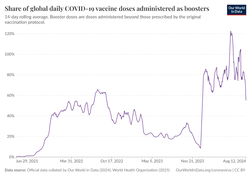Official data collated by Our World in Data (2024); World Health Organisation (2025) – with major processing by Our World in Data. “Share of global daily COVID-19 vaccine doses administered as boosters” [dataset]. Official data collated by Our World in Data, “COVID-19, vaccinations”; World Health Organisation, “COVID-19, vaccinations (WHO)” [original data]. Retrieved March 13, 2026 from https://admin-refresh-dis.owid.pages.dev/grapher/covid-vaccine-share-boosters