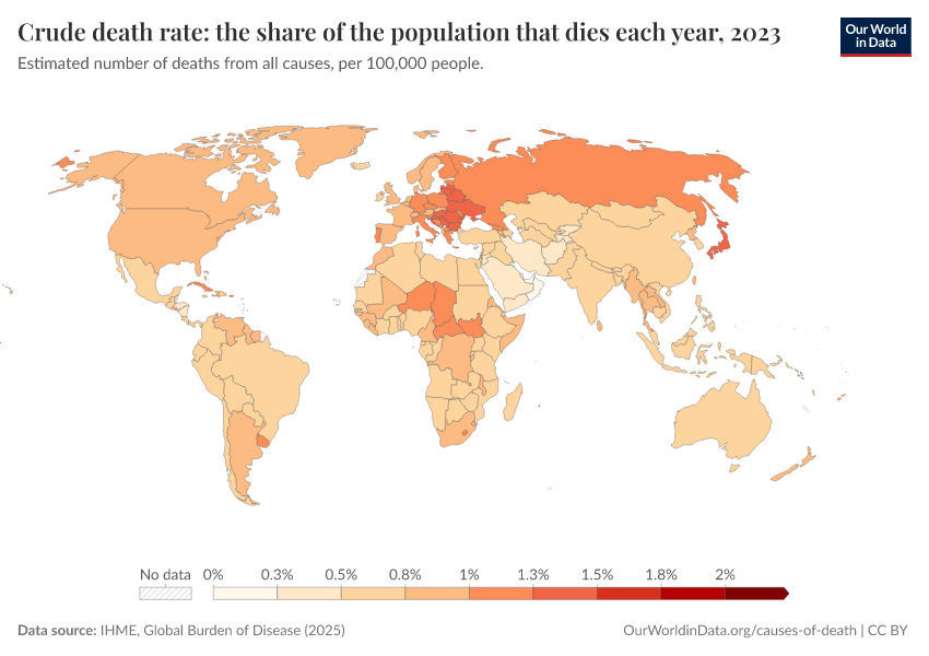 IHME, Global Burden of Disease (2025) – with major processing by Our World in Data. “Crude death rate: the share of the population that dies each year” [dataset]. IHME, Global Burden of Disease, “Global Burden of Disease - Deaths” [original data]. Retrieved March 13, 2026 from https://admin-refresh-dis.owid.pages.dev/grapher/crude-death-rate-the-share-of-the-population-that-dies-each-year-gbd