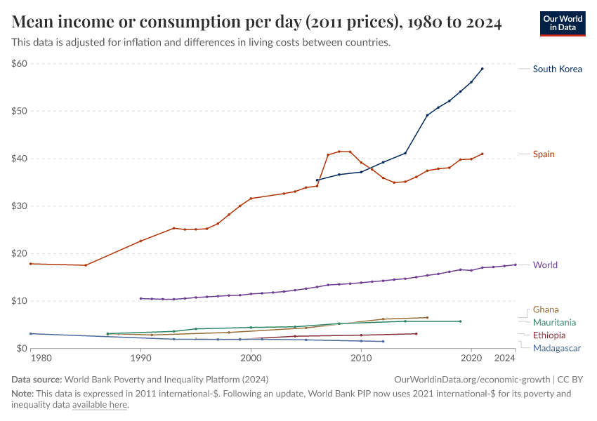 “Data Page: Mean income or consumption per day (2011 prices)”, part of the following publication: Joe Hasell, Bertha Rohenkohl, Pablo Arriagada, Esteban Ortiz-Ospina, and Max Roser (2022) - “Poverty”. Data adapted from World Bank Poverty and Inequality Platform. Retrieved from https://admin-refresh-dis.owid.pages.dev/grapher/daily-mean-income-2011-ppp [online resource]How to cite this data