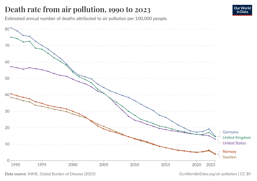 IHME, Global Burden of Disease (2025) – with major processing by Our World in Data. “Death rate from air pollution” [dataset]. IHME, Global Burden of Disease, “Global Burden of Disease - Risk Factors - Deaths” [original data]. Retrieved March 13, 2026 from https://admin-refresh-dis.owid.pages.dev/grapher/death-rate-from-air-pollution-per-100000