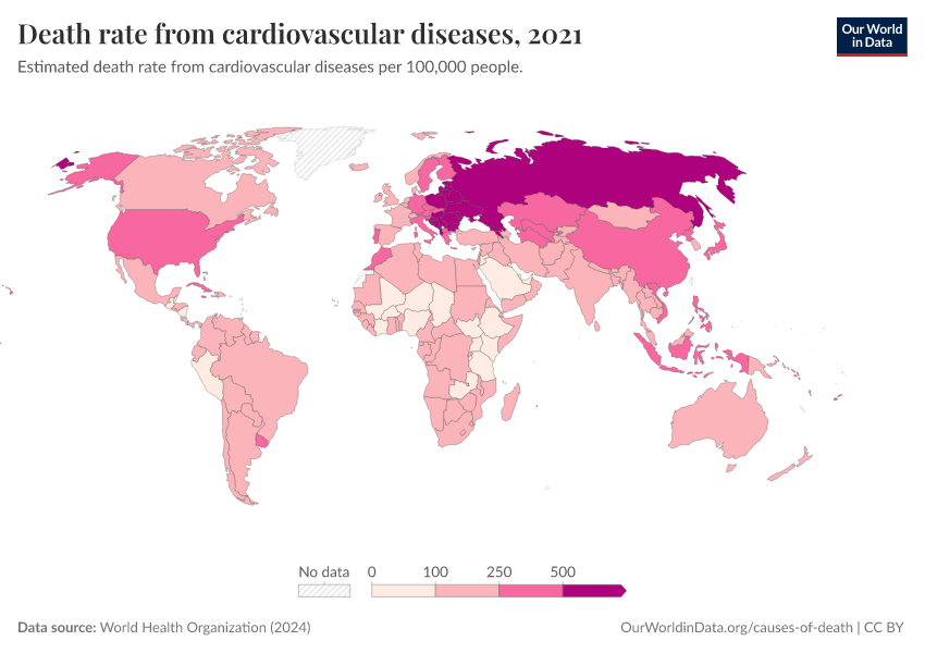 World Health Organization (2024) – with major processing by Our World in Data. “Death rate from cardiovascular diseases” [dataset]. World Health Organization, “Global Health Estimates” [original data]. Retrieved March 13, 2026 from https://admin-refresh-dis.owid.pages.dev/grapher/death-rate-from-cardiovascular-disease-ghe