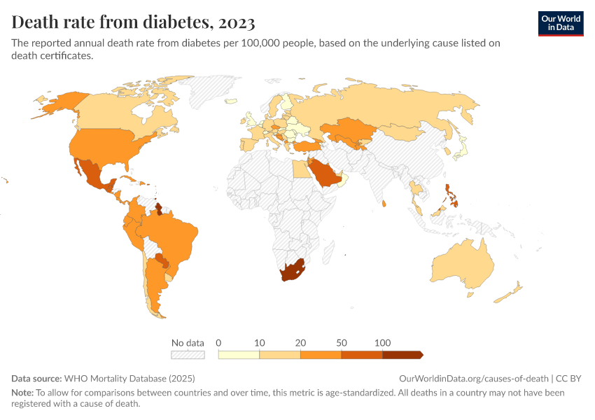 “Data Page: Death rate from diabetes”, part of the following publication: Saloni Dattani, Fiona Spooner, Hannah Ritchie, and Max Roser (2023) - “Causes of Death”. Data adapted from WHO Mortality Database. Retrieved from https://admin-refresh-dis.owid.pages.dev/grapher/death-rate-from-diabetes-who-mdb [online resource]How to cite this data
