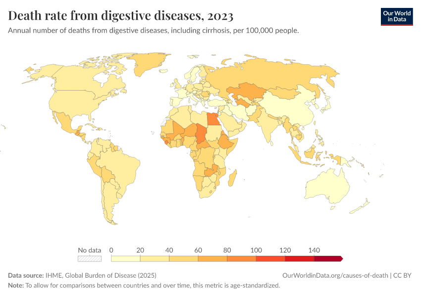 IHME, Global Burden of Disease (2025) – with major processing by Our World in Data. “Death rate from digestive diseases” [dataset]. IHME, Global Burden of Disease, “Global Burden of Disease - Deaths” [original data]. Retrieved March 13, 2026 from https://admin-refresh-dis.owid.pages.dev/grapher/death-rate-from-digestive-diseases