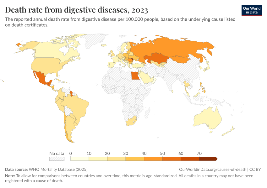 “Data Page: Death rate from digestive diseases”, part of the following publication: Saloni Dattani, Fiona Spooner, Hannah Ritchie, and Max Roser (2023) - “Causes of Death”. Data adapted from WHO Mortality Database. Retrieved from https://admin-refresh-dis.owid.pages.dev/grapher/death-rate-from-digestive-diseases-who-mdb [online resource]How to cite this data