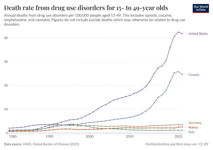 IHME, Global Burden of Disease (2025) – with major processing by Our World in Data. “Death rate from drug use disorders for 15- to 49-year olds” [dataset]. IHME, Global Burden of Disease, “Global Burden of Disease - Deaths” [original data]. Retrieved March 13, 2026 from https://admin-refresh-dis.owid.pages.dev/grapher/death-rate-from-drug-use-disorders-for-15--to-49-year-olds