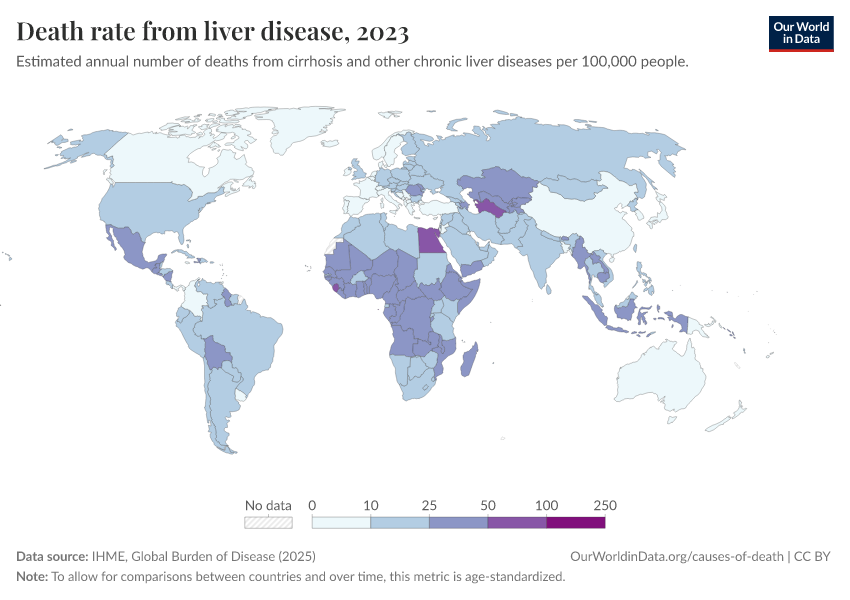 IHME, Global Burden of Disease (2025) – with major processing by Our World in Data. “Death rate from liver disease” [dataset]. IHME, Global Burden of Disease, “Global Burden of Disease - Deaths” [original data]. Retrieved March 13, 2026 from https://admin-refresh-dis.owid.pages.dev/grapher/death-rate-from-liver-disease