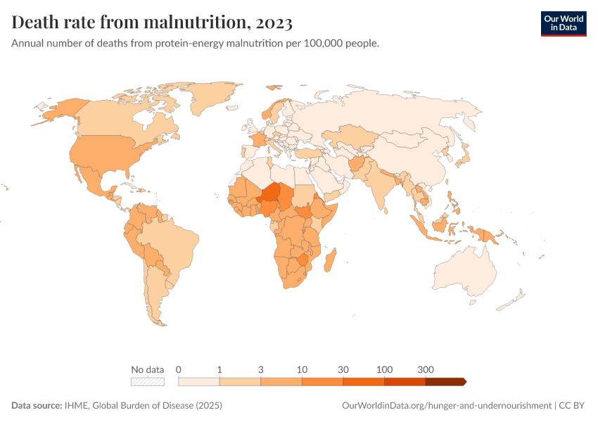 IHME, Global Burden of Disease (2025) – with major processing by Our World in Data. “Death rate from malnutrition” [dataset]. IHME, Global Burden of Disease, “Global Burden of Disease - Deaths” [original data]. Retrieved March 13, 2026 from https://admin-refresh-dis.owid.pages.dev/grapher/death-rate-from-malnutrition