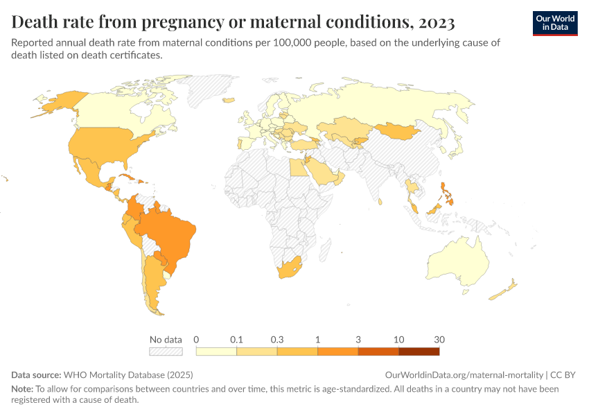 WHO Mortality Database (2025) – with minor processing by Our World in Data. “Death rate from pregnancy or maternal conditions” [dataset]. WHO Mortality Database, “WHO Mortality Database” [original data]. Retrieved March 13, 2026 from https://admin-refresh-dis.owid.pages.dev/grapher/death-rate-from-maternal-disorders