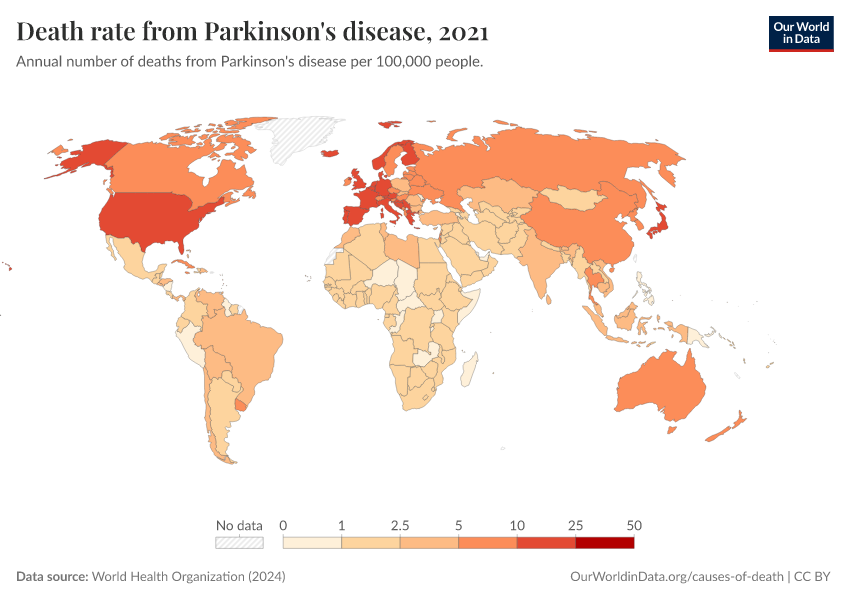 World Health Organization (2024) – with major processing by Our World in Data. “Death rate from Parkinson's disease” [dataset]. World Health Organization, “Global Health Estimates” [original data]. Retrieved March 13, 2026 from https://admin-refresh-dis.owid.pages.dev/grapher/death-rate-from-parkinsons-disease-ghe