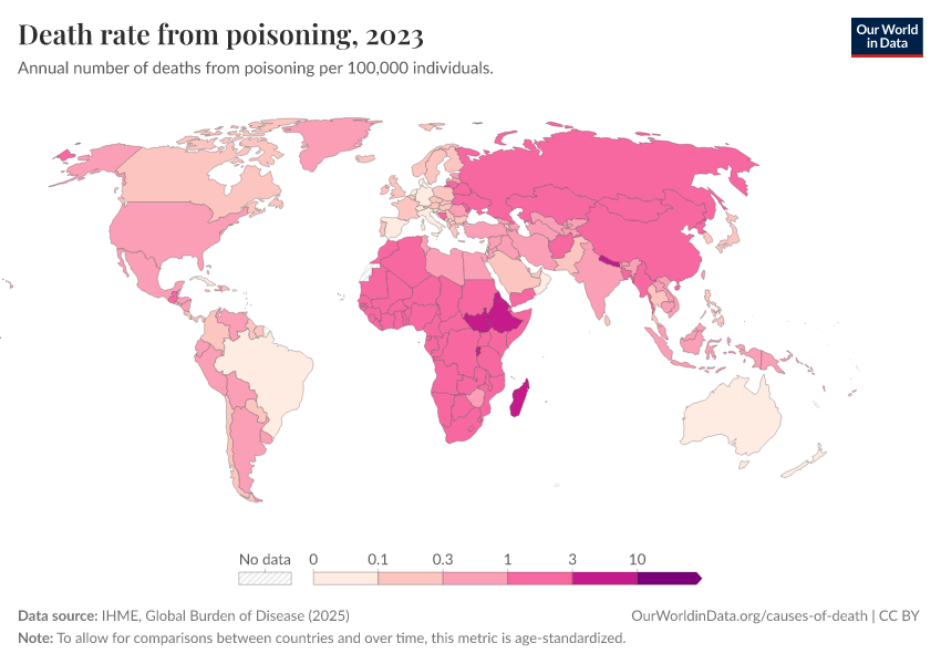 IHME, Global Burden of Disease (2025) – with major processing by Our World in Data. “Death rate from poisoning” [dataset]. IHME, Global Burden of Disease, “Global Burden of Disease - Deaths” [original data]. Retrieved March 13, 2026 from https://admin-refresh-dis.owid.pages.dev/grapher/death-rate-from-poisoning