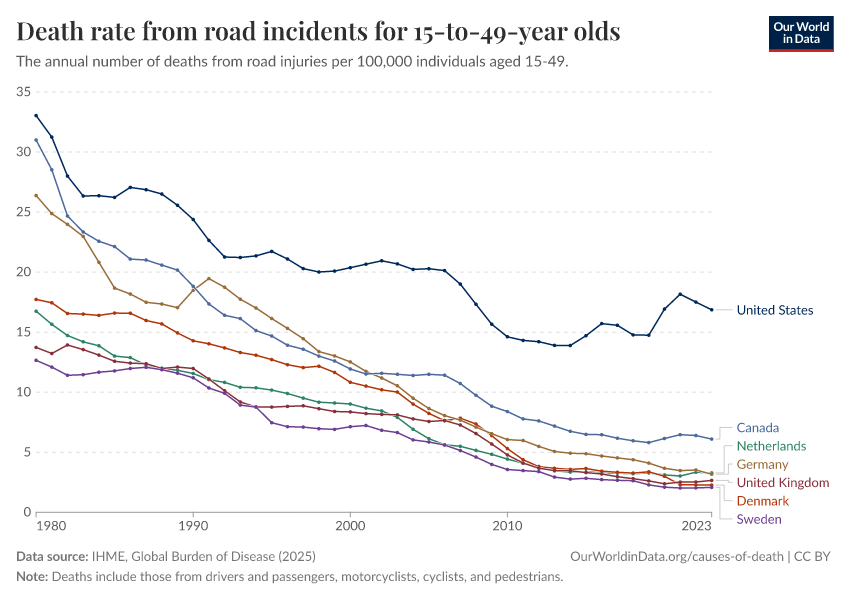 IHME, Global Burden of Disease (2025) – with major processing by Our World in Data. “Death rate from road incidents for 15-to-49-year olds” [dataset]. IHME, Global Burden of Disease, “Global Burden of Disease - Deaths” [original data]. Retrieved March 13, 2026 from https://admin-refresh-dis.owid.pages.dev/grapher/death-rate-from-road-accidents-for-15--to-49-year-olds