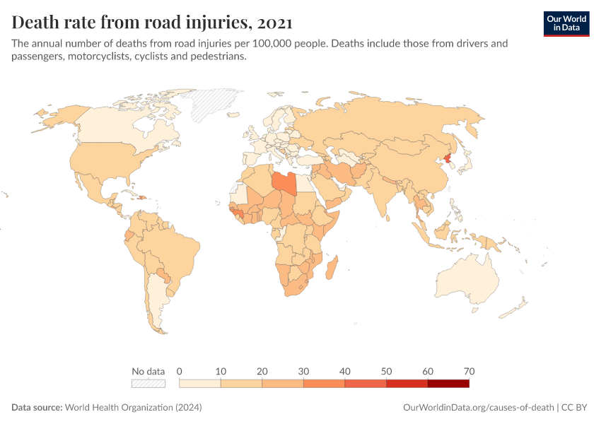World Health Organization (2024) – with major processing by Our World in Data. “Death rate from road injuries” [dataset]. World Health Organization, “Global Health Estimates” [original data]. Retrieved March 13, 2026 from https://admin-refresh-dis.owid.pages.dev/grapher/death-rate-from-road-accidents-ghe