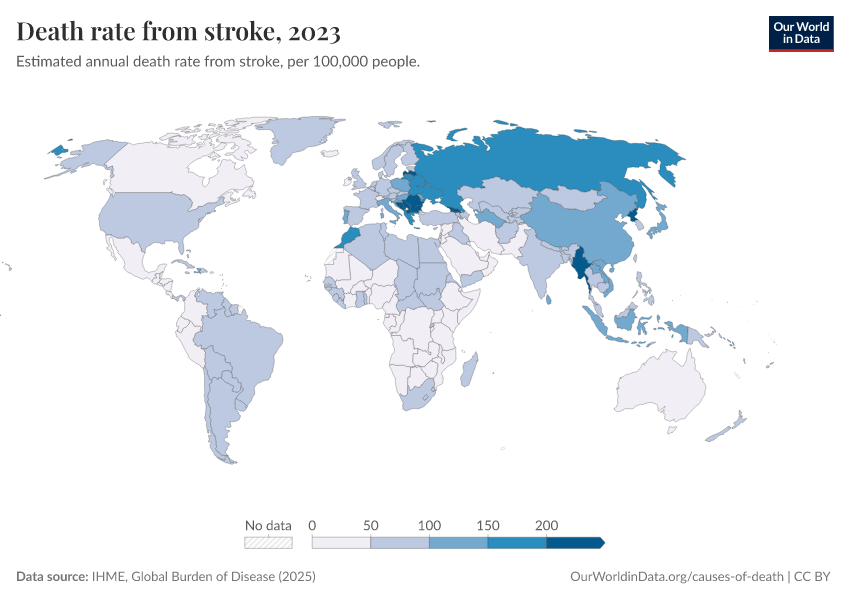 IHME, Global Burden of Disease (2025) – with major processing by Our World in Data. “Death rate from stroke” [dataset]. IHME, Global Burden of Disease, “Global Burden of Disease - Deaths” [original data]. Retrieved March 13, 2026 from https://admin-refresh-dis.owid.pages.dev/grapher/death-rate-from-strokes