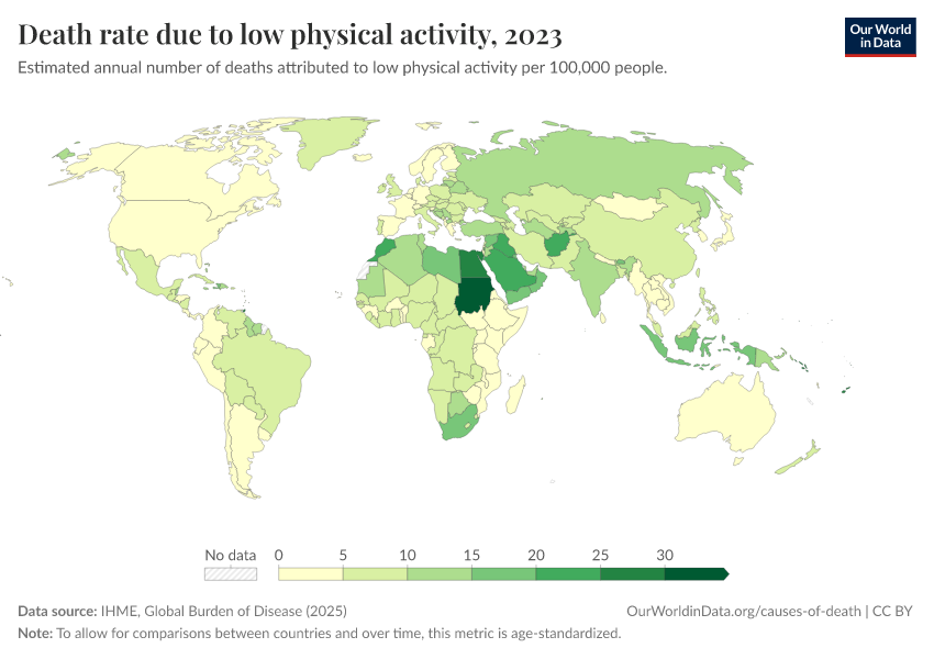 “Data Page: Death rate due to low physical activity”, part of the following publication: Esteban Ortiz-Ospina and Max Roser (2016) - “Global Health”. Data adapted from IHME, Global Burden of Disease. Retrieved from https://admin-refresh-dis.owid.pages.dev/grapher/death-rates-due-to-low-physical-activity [online resource]How to cite this data