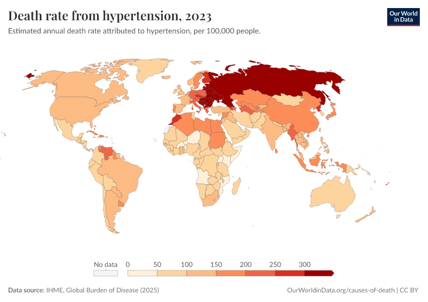 IHME, Global Burden of Disease (2025) – with major processing by Our World in Data. “Death rate from hypertension” [dataset]. IHME, Global Burden of Disease, “Global Burden of Disease - Risk Factors - Deaths” [original data]. Retrieved March 13, 2026 from https://admin-refresh-dis.owid.pages.dev/grapher/death-rates-from-high-blood-pressure-gbd