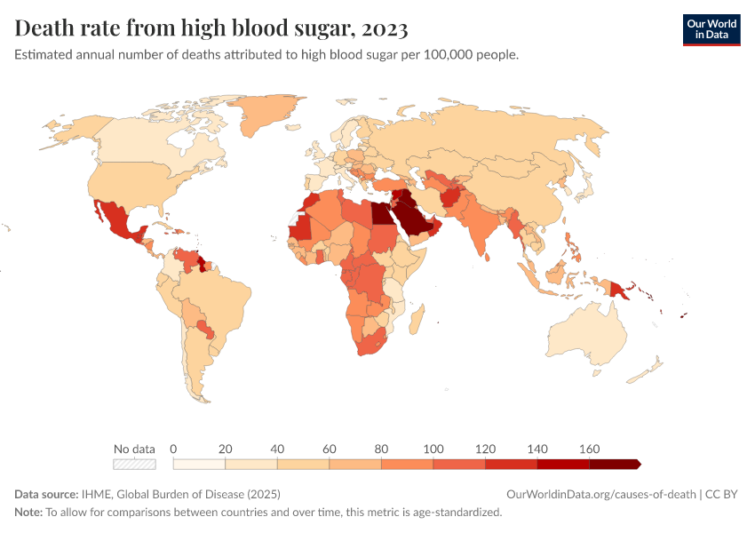 IHME, Global Burden of Disease (2025) – with major processing by Our World in Data. “Death rate from high blood sugar” [dataset]. IHME, Global Burden of Disease, “Global Burden of Disease - Risk Factors - Deaths” [original data]. Retrieved March 13, 2026 from https://admin-refresh-dis.owid.pages.dev/grapher/death-rates-from-high-blood-sugar