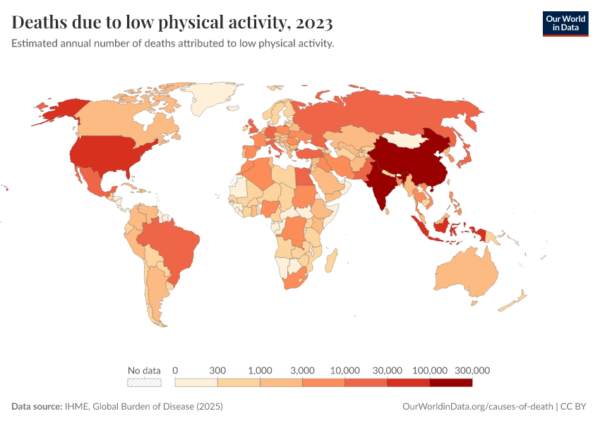 “Data Page: Deaths due to low physical activity”, part of the following publication: Esteban Ortiz-Ospina and Max Roser (2016) - “Global Health”. Data adapted from IHME, Global Burden of Disease. Retrieved from https://admin-refresh-dis.owid.pages.dev/grapher/deaths-due-to-low-physical-activity [online resource]How to cite this data