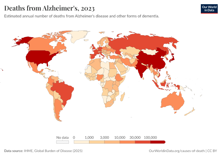 IHME, Global Burden of Disease (2025) – with major processing by Our World in Data. “Deaths from Alzheimer's” [dataset]. IHME, Global Burden of Disease, “Global Burden of Disease - Deaths” [original data]. Retrieved March 13, 2026 from https://admin-refresh-dis.owid.pages.dev/grapher/deaths-from-alzheimers