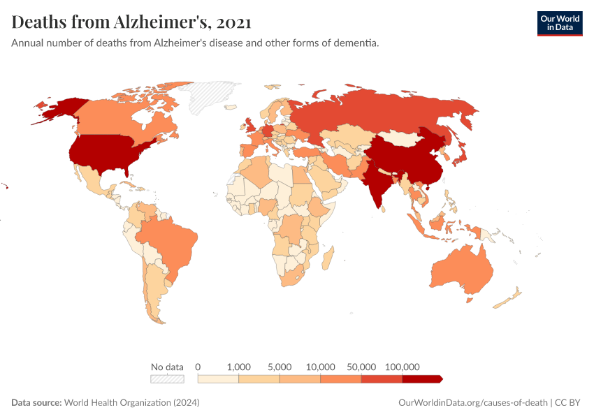 “Data Page: Deaths from Alzheimer's”, part of the following publication: Esteban Ortiz-Ospina and Max Roser (2016) - “Global Health”. Data adapted from World Health Organization. Retrieved from https://admin-refresh-dis.owid.pages.dev/grapher/deaths-from-alzheimers-other-dementias [online resource]How to cite this data