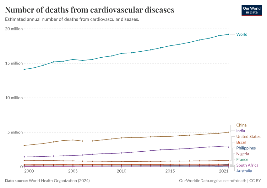 World Health Organization (2024) – with major processing by Our World in Data. “Number of deaths from cardiovascular diseases” [dataset]. World Health Organization, “Global Health Estimates” [original data]. Retrieved March 13, 2026 from https://admin-refresh-dis.owid.pages.dev/grapher/deaths-from-cardiovascular-disease-ghe