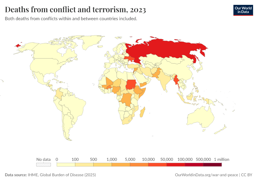 “Data Page: Deaths from conflict and terrorism”, part of the following publication: Esteban Ortiz-Ospina and Max Roser (2016) - “Global Health”. Data adapted from IHME, Global Burden of Disease. Retrieved from https://admin-refresh-dis.owid.pages.dev/grapher/deaths-from-conflict-and-terrorism [online resource]How to cite this data