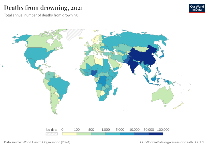 “Data Page: Deaths from drowning”, part of the following publication: Esteban Ortiz-Ospina and Max Roser (2016) - “Global Health”. Data adapted from World Health Organization. Retrieved from https://admin-refresh-dis.owid.pages.dev/grapher/deaths-from-drowning-ghe [online resource]How to cite this data