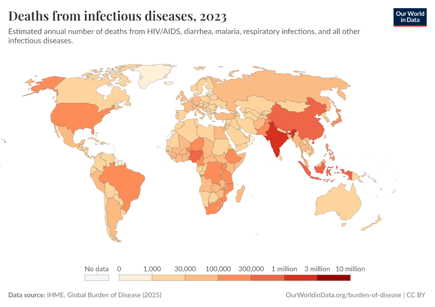 IHME, Global Burden of Disease (2025) – with major processing by Our World in Data. “Deaths from infectious diseases” [dataset]. IHME, Global Burden of Disease, “Global Burden of Disease - Deaths” [original data]. Retrieved March 13, 2026 from https://admin-refresh-dis.owid.pages.dev/grapher/deaths-from-infectious-diseases