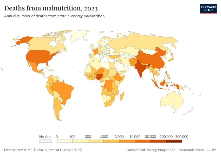 IHME, Global Burden of Disease (2025) – with major processing by Our World in Data. “Deaths from malnutrition” [dataset]. IHME, Global Burden of Disease, “Global Burden of Disease - Deaths” [original data]. Retrieved March 13, 2026 from https://admin-refresh-dis.owid.pages.dev/grapher/deaths-from-malnutrition