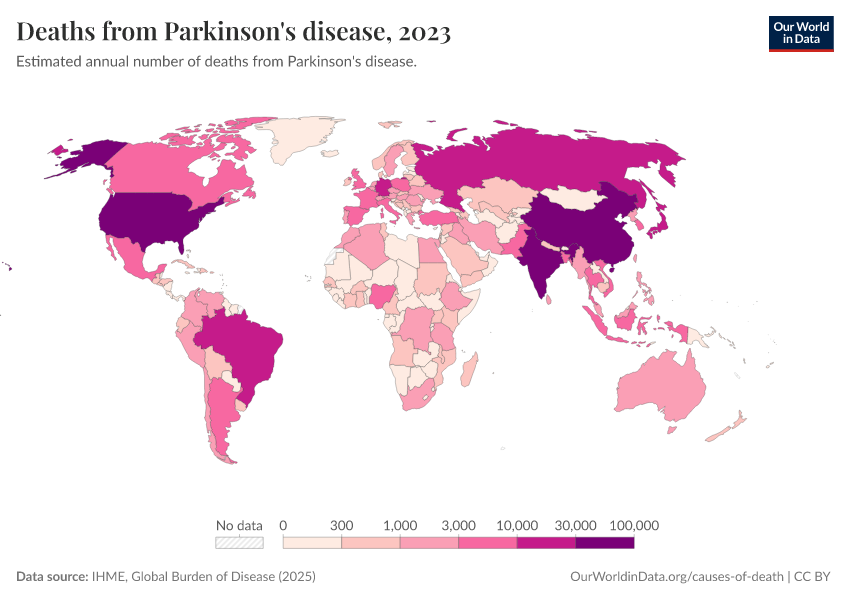 IHME, Global Burden of Disease (2025) – with major processing by Our World in Data. “Deaths from Parkinson's disease” [dataset]. IHME, Global Burden of Disease, “Global Burden of Disease - Deaths” [original data]. Retrieved March 13, 2026 from https://admin-refresh-dis.owid.pages.dev/grapher/deaths-from-parkinsons-disease